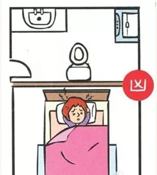 房间里的厕所对到床,情况比房门对到厕所严重,对到头,会头痛、思考时不能集中,住久了会产生肿瘤、中风等;对到腰,会腰酸、心脏无力、水肿,住久了会产生糖尿病、心脏病;对到脚,会坐骨酸痛、膝盖无力、痛风水肿,住久了会产生意外骨折。