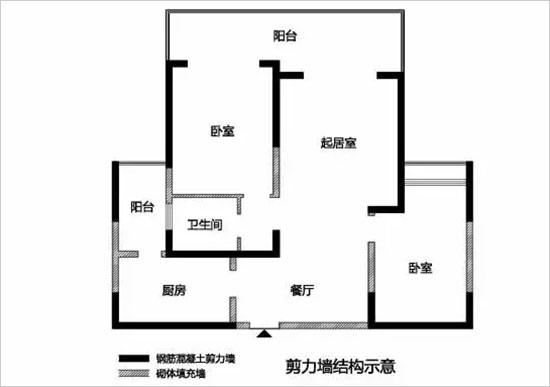 剪力墙结构:看户型图,黑色墙体都不能拆除。涂黑的墙体,是钢筋混凝土剪力墙,不要破坏。斜线填充是砌块墙体,不起结构作用,可以适当改建。用钢筋混凝土墙板承受竖向和水平力的结构,多适用于高层住宅,9层以上的住宅基本都是剪力墙结构。