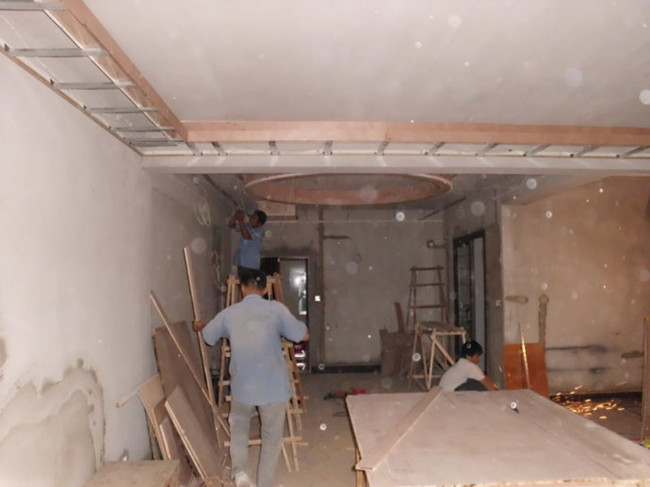 业主在房间的一角做了个弧度的吊顶,主要功能是藏中央空调的内机。先在天顶上用木桩来定位,这步是很关键的,如果木桩尺寸有所出入,那做出来的弧度就不完美了,然后贴上饰面板就行了。