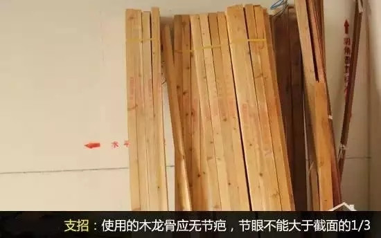 龙骨截面积要注意木龙骨的节眼不能大于截面的1/3,水平木龙骨的小面积尺寸应该是25*30mm,大面积吊顶应是25*35mm。
