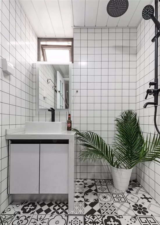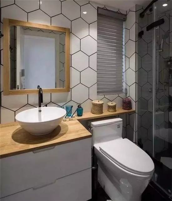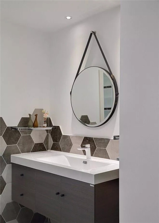 就像这个圆镜,展现出一个简约风的效果,搭配颜色不一样的六角砖,也能展现出别样的美感。