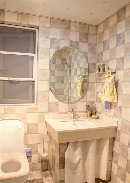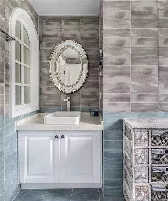 砖砌洗手台也是一个不错的选择,和仿古砖搭配在一起,适合田园风、美式风、地中海风格的设计,这面造型独特的镜子,更是增添了更多的美感。