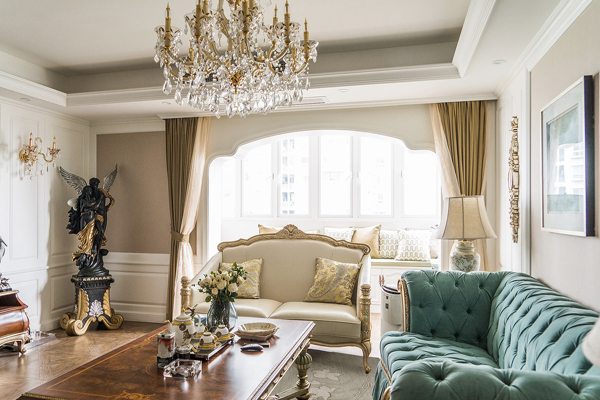 2、织物家具:这种家具少出现木材,大多以织物包裹家具主体,通过布料或皮革本身的质感来营造华丽古典的气氛。如,丝绒沙发,皮革方茶几等。