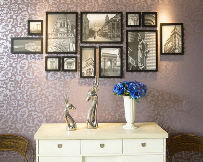 相片墙的组合比较自由,但并不是说将墙壁贴得满满当当就美了。相框的形状有很多,长方形、正方形、菱形等等,通过这些形状各异的相框组合在一起,就能形成凌乱的视觉冲击。因此就要了解清楚尺寸大小了,最大用几寸,最小用几寸,只有这样才能在设计相片墙的时候得心应手。一般相框之间距离为5厘米为佳,不过这个也要看个人喜好,有些人喜欢小相框,也有些人喜欢越大越好,只要能将它们组合成一个整体就行。