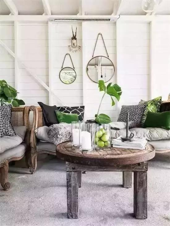 一个白色调的小木屋,在布艺软装上使用了灰色、黑色与绿色,沙发上几只绿色的抱枕,与室内的几株植物形成呼应,营造出清爽的氛围。