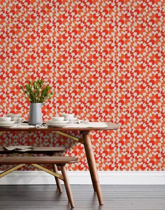绿色植物也可以与家居整体色调形成碰撞,在橙色系花纹壁纸的衬托下,餐桌上的小盆栽显得十分突出显眼,形成了视觉上的焦点。