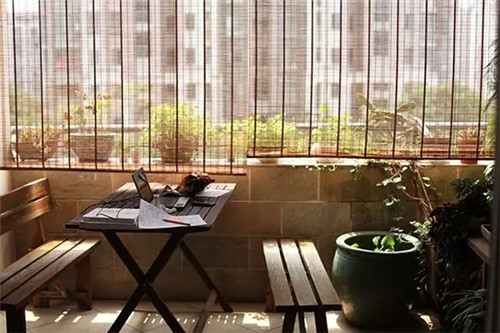 比较有趣的阳台装修,阳台设计的比较低矮,再用上比较粗砾的岩石砖,配上植物、大水缸、户外材质的桌椅,和风软帘。