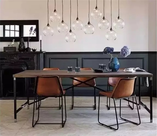 餐厅吊灯不要选择灯罩完全不透光的设计,这样会使空间明暗对比过于强烈,反面会让人很不舒服!如查很喜欢这类吊灯,可以在上设置小功率射灯以达到光线平衡。
