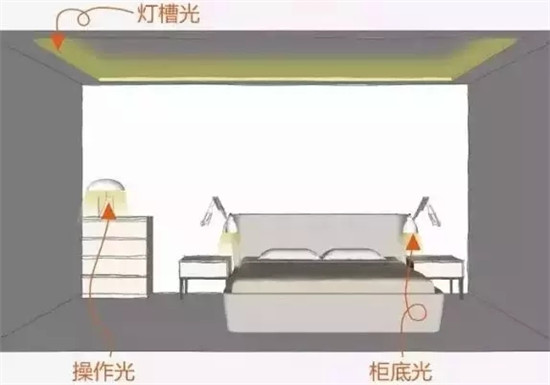 以灯槽取代吊灯光,这样光线更为柔和,且没有外露光源。灯槽光足以满足卧室内一般的使用功能!
