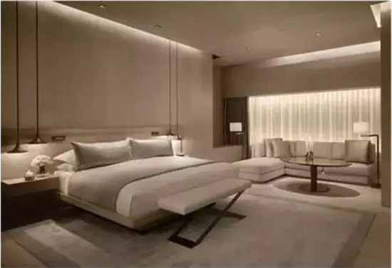 卧室是人最重要的休息与私密的空间,卧室的灯光层次丰富,但是都柔光为主照明方式。