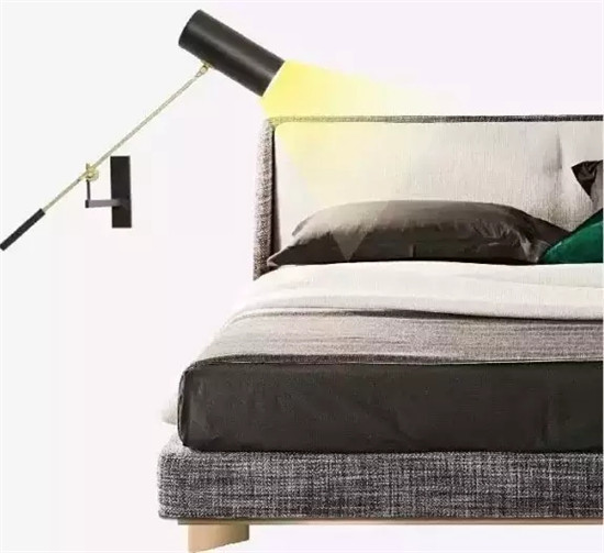 床侧选择摇臂式壁灯,用以满足卧室的阅读功能,而且单控的摇臂式壁灯可以调控光线角度,有效避免影响他人入睡,壁灯还不占用紧张的床头柜面积。
