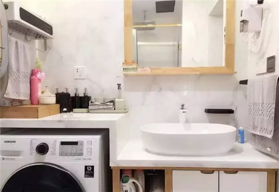 略有梯度的设计(如上图),给整个台面做了明确的区分。高出的一端可以防止洗衣机等大型家电,洗手台下则可以安装木质橱柜,大大增加了收纳功能。
