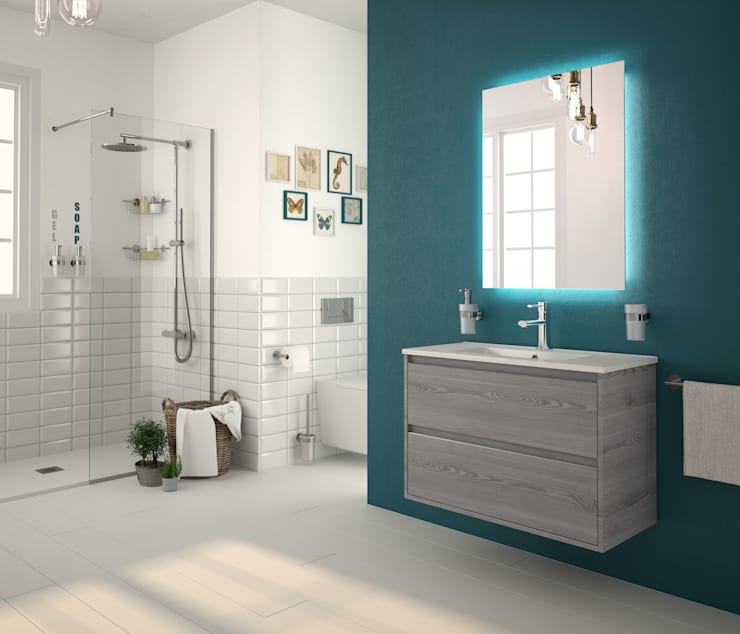 你可以选择像图片一样,贴上不同形状的镜子,利用反射的效果让浴室看起来更为宽敞。但是请注意,不要让镜面面向彼此,避免吊诡的反射情形产生。