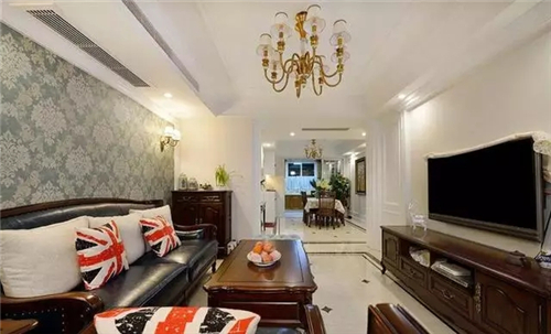 客厅,简单的美式装潢,吊顶线条明朗,电视墙和沙发墙用装饰条来打造层次感。
