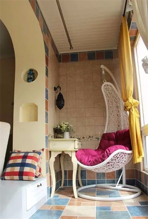小编的话:带有一些地中海混搭风的阳台空间里,在圆拱门下方装修出一小个抽屉式收纳小隔断,既能作为空间分隔,还能够当做座位来使用,让整个阳台空间看上去休闲舒适感倍增。