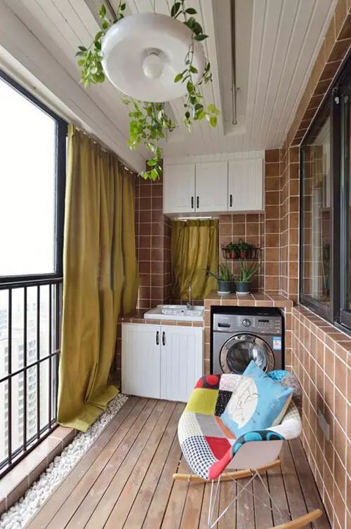 小编的话:以木质与砖墙结合,这个阳台空间中还专门为滚筒洗衣机留了一个位置,便于平日里在这边清洗衣物,小巧简单,空间中加以绿植的点缀,这样的一间阳台空间应该算是比较大众化的,却很实用。