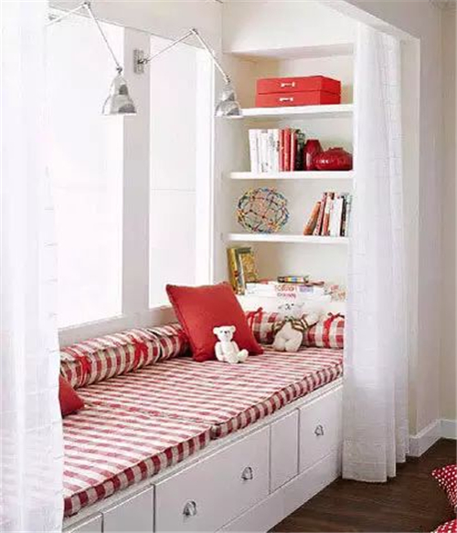 小编的话:如果说家中阳台空间本来就不是太大的话,索性就学学这款阳台装修,把整个阳台区域作成一个飘窗区域,再利用墙面作内嵌收纳格出来,下方还有大大的收纳抽屉。平时既能在这边休息,还能够利用这块空间作为收纳区哦。