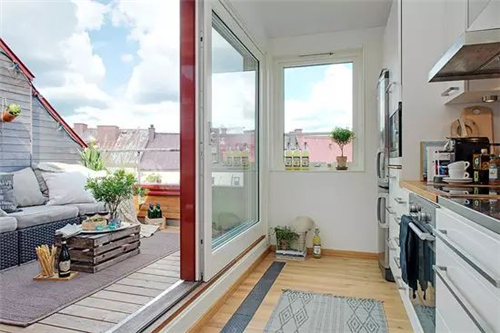 编辑点评:玻璃移门隔断了厨房和室外休闲区,同时也从视觉上拓宽了厨房空间,为室内创造了更充足的采光条件。