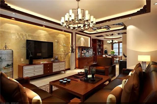 首先客厅整体以中式红木打造,很有中国式的文化底蕴,看上去很有档次的感觉,是个富贵人家;