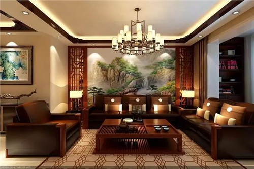 山水画的瓷砖沙发背景墙,配上中式木作,让客厅显得更加大气高档,像是稳坐泰山的感觉;