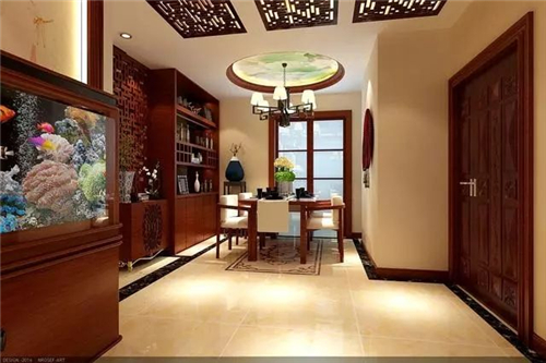玄关这里有个鱼缸,大门右边是餐厅,中式的餐桌椅搭配实木的餐边柜,显得档次十足;