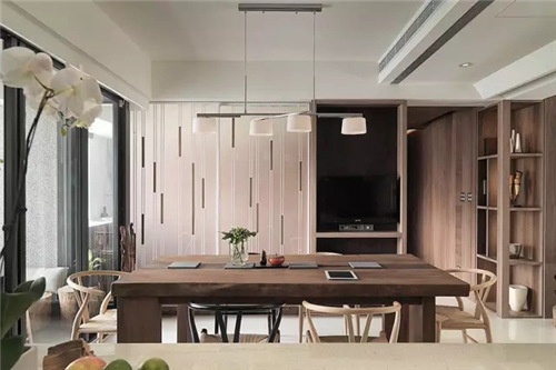 ▲木质餐桌搭配简易的原木太师椅,清新,淡雅。外加几盏乳白色吊灯整体变得分外温馨。
