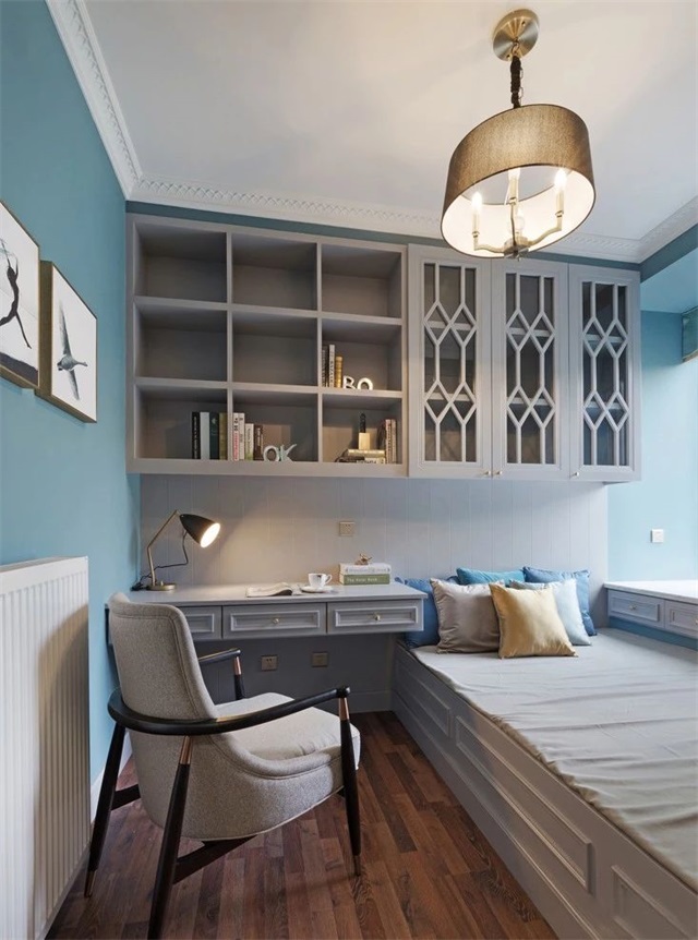 这样不仅可以拥有书房,还可以把这个空间作为休闲或客房用,整个空间的利用率更加好。把书桌跟榻榻米床组合在一起,书桌上方还可以装上书架,整体就显得更加实用大方。