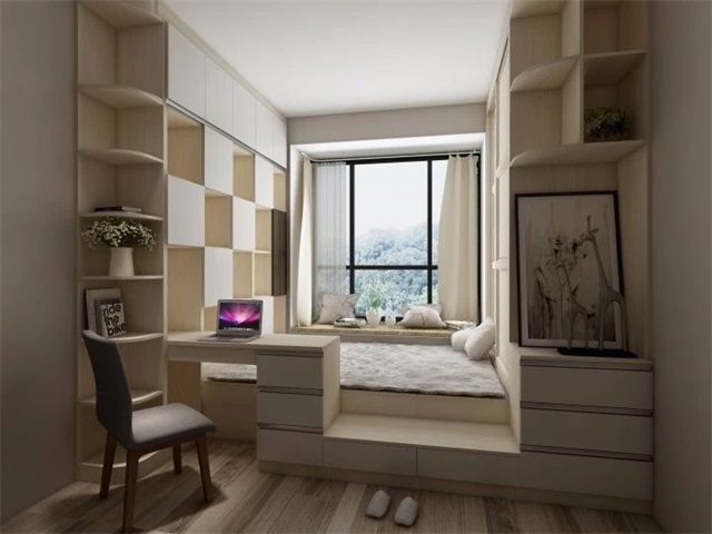 榻榻米下方可以做成巨大的储物空间,小卧室空间也可以利用起来。换季的被子、衣物等,这种一年也拿取几次的东西,可以放在榻榻米下。
