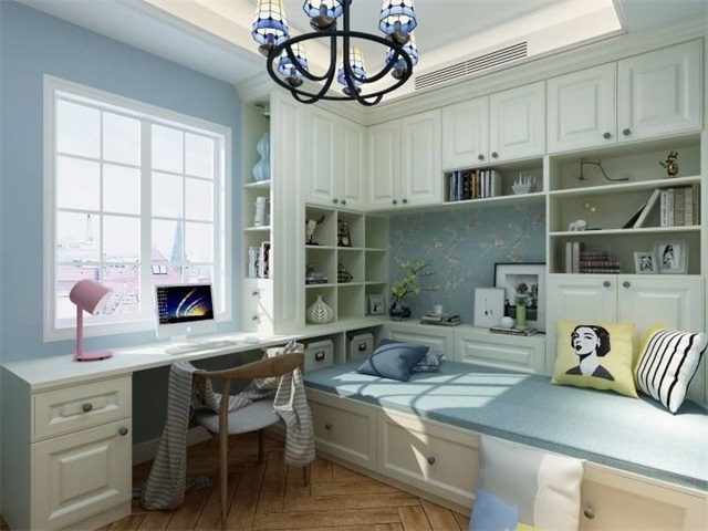 转角柜与矮柜的拼搭使之更加协调的衔接起来,吊柜与书桌的设计,整个空间可以根据需求进行灵活多变的设计。