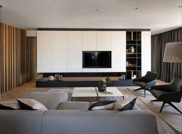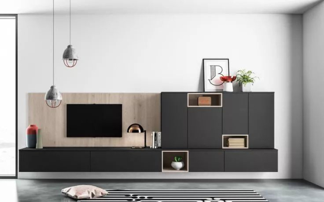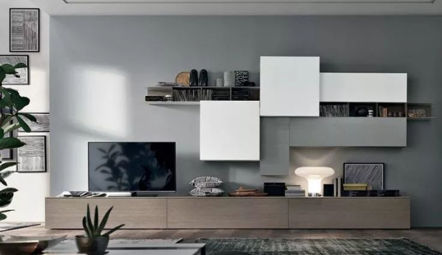 电视柜也可以采用现代式的地柜与吊柜结合设计,会更有个性感。而且居住者还能根据不同时期的需要作相应的变化,可谓是集功能性与灵活性于一体。