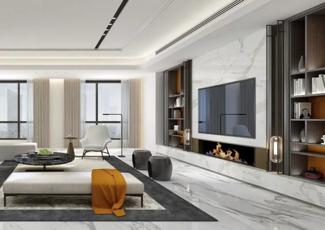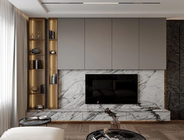如果电视背景墙想要以展示和美观为主,可以在大理石、木材或石膏板等电视背景墙上嵌入壁龛,新颖的结合方式,可以为空间带来意想不到的装饰性。
