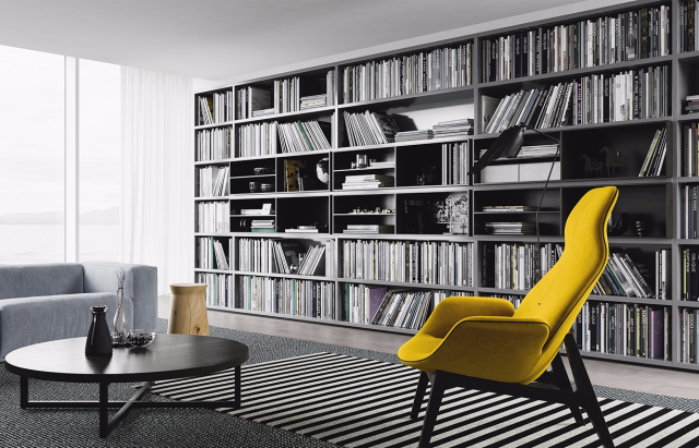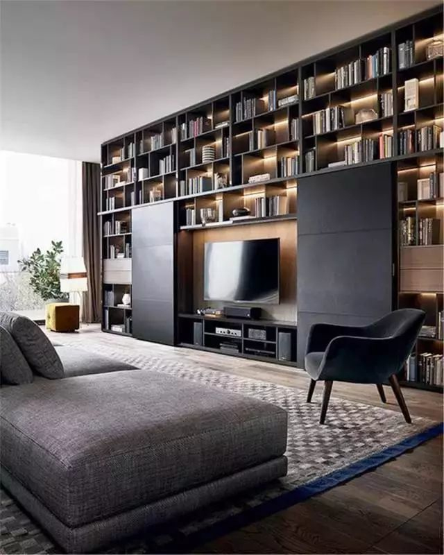 一些户型较小的居室,往往将书房的功能与客厅进行合并,因此客厅会有大量的书籍需要进行收纳。常见的收纳方式是在沙发边设计开放式书柜,既方便拿取,又不会占用过多的空间。