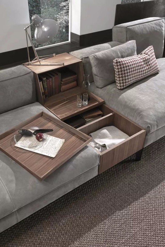高低不等的边几看似没有强大的收纳功能,但是却可以根据不同的使用要求,与其他家具搭配使用,来客人了,也能有放茶杯的地方。如果是喜爱阅读的业主,也可以在边几上搁置常看的书籍。还可以选择带有边柜台面的沙发,更加方便实用。