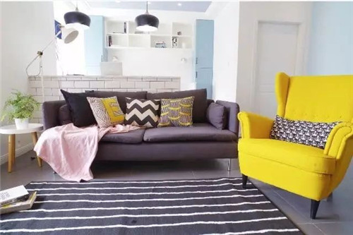 打通沙发墙用作吧台,扩大客厅面积。简单清新的色彩能融化旅行的疲惫。