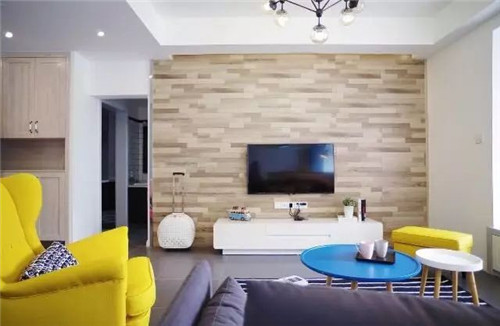 原木色地板上墙,构成了一个简单自然的电视墙,白色旅行包是旅行不能或缺的必备品,此刻休息的它又成了一个不错的装饰品。
