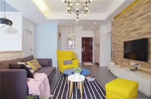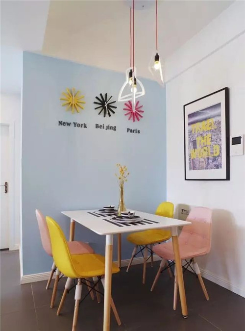 白色、粉蓝、灰色、原木构成硬装色彩的调子,突出的黄、柔和的粉,活泼了整个空间。