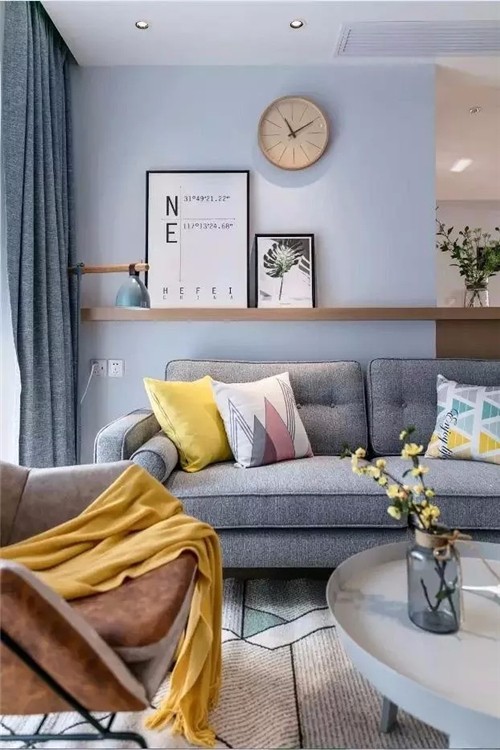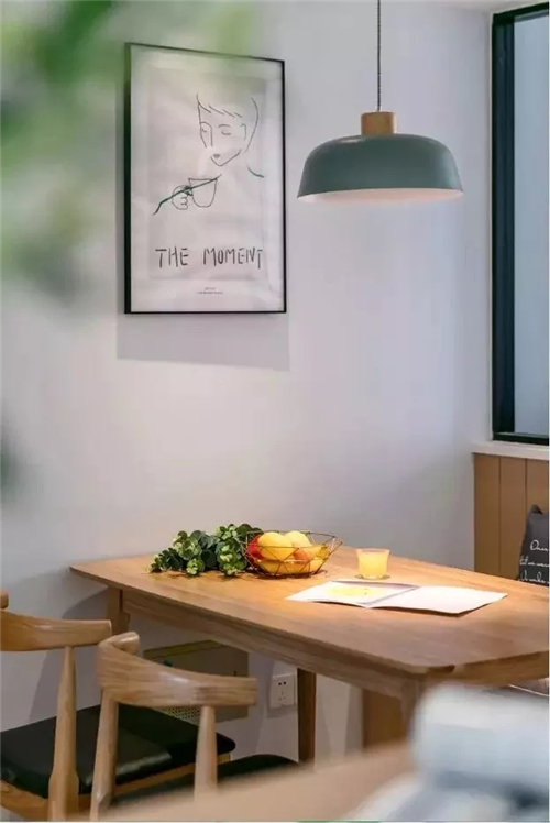 为了避免素色空间的乏味,女主人挑了亮色的软装饰品点缀,轻松提升空间的活力感。透明的大玻璃窗,让充沛的阳光洒入室内。木色吧台延伸至灰蓝色乳胶漆立面,点缀大小简框画与挂钟,呈现清新文艺格调。