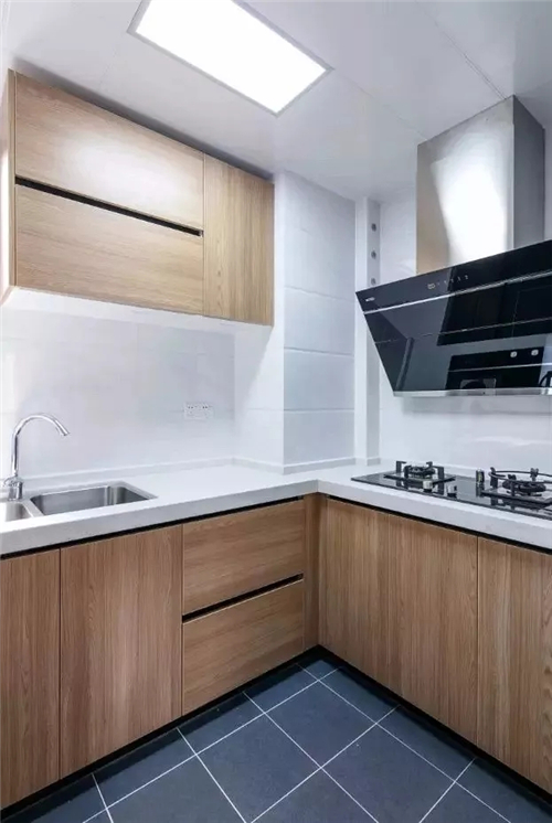 厨房占地面积小,小户型可以参考。收纳相对好,洗切煮一气呵成。地面铺贴深灰色瓷砖,墙面铺贴白色仿石纹瓷砖,橱柜拉手的隐形设计整体干脆利落。