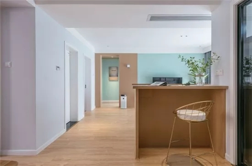 开放式的布局让功能区的联系显得更为紧密,在浅蓝色与白色两种素色背景墙的利落搭配下,木元素的融入可以带来居家的温暖感受,让沉稳与质感和温暖柔和达到平衡。