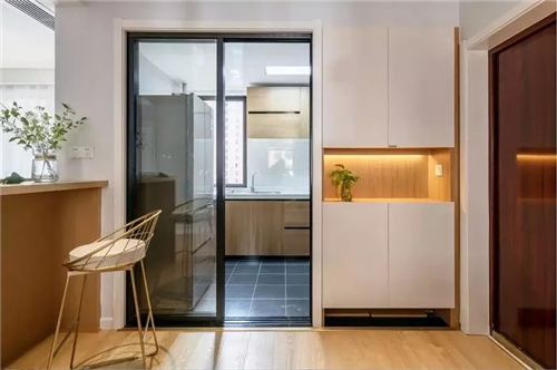 入户利用厨房的空间做了一组入墙式分体鞋柜,方便进门后置放钥匙等物件,局部留空加入灯带,增添入户光线与层次。