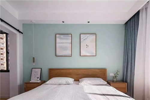 主卧木色地板与木质家具,书桌柜是定制家具,能更好的适应户型,卧室的边边角角也能充分利用。让卧室兼顾了书房、梳妆、办公的功能。另外搭配蓝绿色背景墙与窗帘,具有设计感的铜色吊灯与背景装饰画用于提升空间整体档次。
