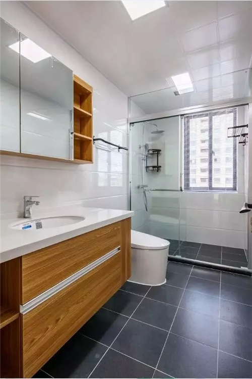 卫生间的干湿分离是常用的二式分离布局模式,地面通铺厨房同款瓷砖,宽大的木色台盆柜与镜柜呼应整体空间质感。