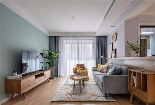 选用绿色系电视背景墙,搭配木色电视柜与侧面走廊设计相呼应,大盆绿植给空间增添生机。
