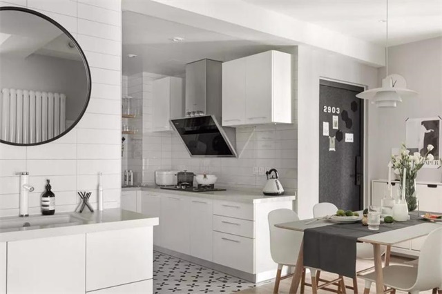 ▼厨房最大的缺点就是没有任何光线,所以设计师用了统一的纯白色设计,让厨卫空间显得大一点也可以显得更加亮堂,墙上的瓷砖是专门选的亮面瓷砖,一点点光的折射、反射就会让空间更大。