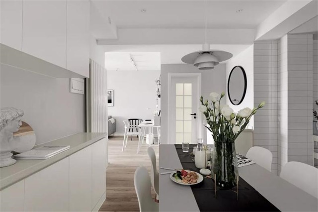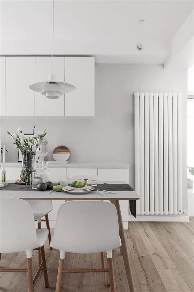 ▼餐厅离入户位置很近而且就在厨房边上,为了避免这个空间过于拥挤,所以设计师尽量简化设计,用了大面积白色家居,在视觉上让这个空间非得干净通透。