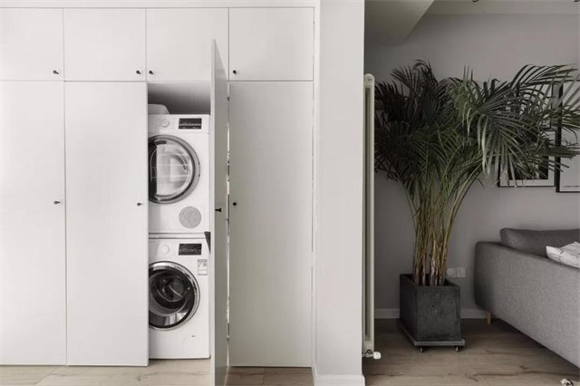 阳台的另一面是超级储物柜,洗衣机和烘干机就藏在里面,然后柜子里还放了很多清洁用品,其中一扇衣柜门里还隐藏这晾晒绳,可以用来挂大件的衣物。