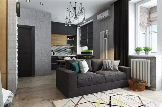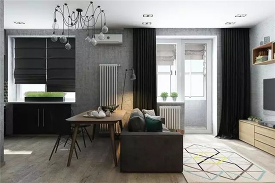 房子小,住的人少,自然不需要太大的沙发,简单的双人沙发足够日常使用。沙发颜色比墙体颜色深,窗帘颜色比沙发深,加上白色,黑白灰的配色简单又清淡。而深色的窗帘,不仅增加空间的层次感,还足够抵挡室外的光线。