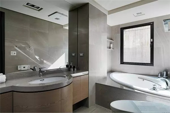 卫生间的设计将收纳功能处理的很好。 盥洗备品主要收纳在浴室外的转角暗柜,这使卫生间内更宽敞清爽,存放东西也更为方便。