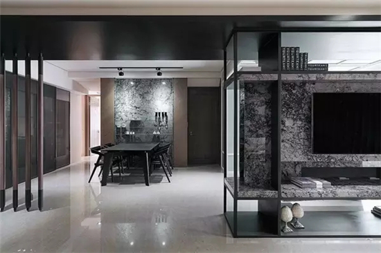 客厅和餐厅是采用透过镂空穿越的结构体,这样就达到开放却有所区分的理性值。也从中反映未来设计追求细致、轻薄的趋势,不会给人厚重感。