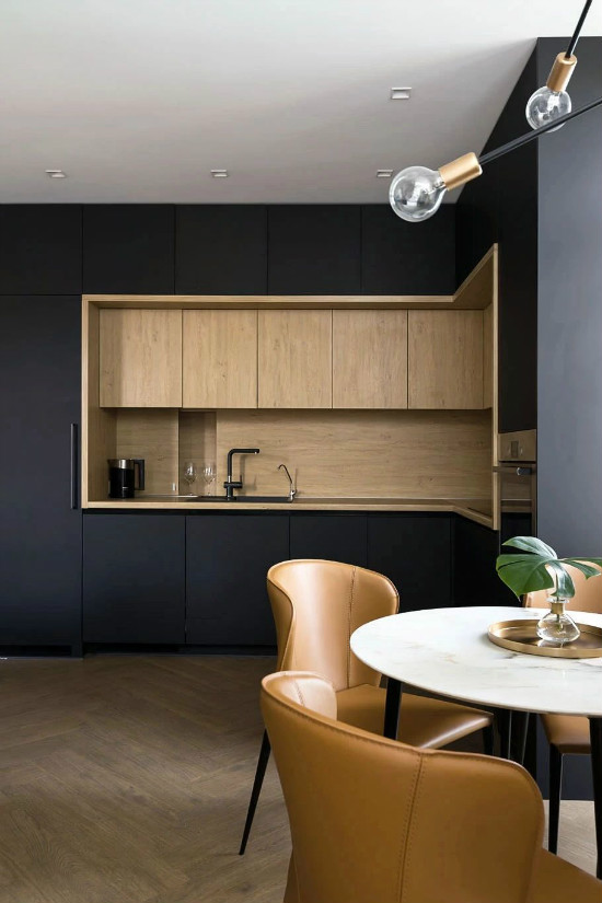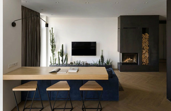 TOT公寓,面积124㎡,透过木色吧台划分厨房与客餐厅,深黑厨柜、灰蓝短绒沙发,与乳白墙、米棕人形拼地面交织一股沉稳都会感。房子设计整体无需渲染华丽的色彩,无需堆砌繁杂的元素,一切回归纯粹的本质。